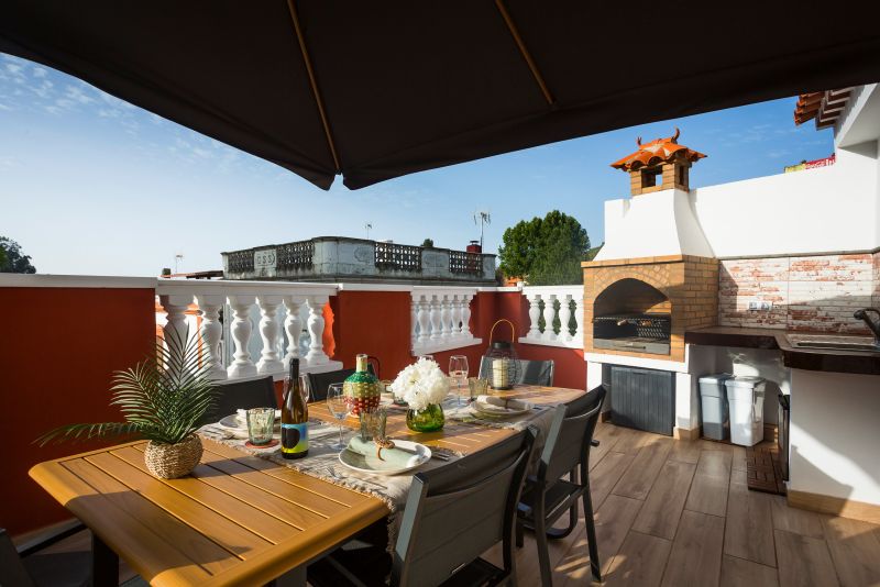 La zona de barbacoa ofrece todas las comodidades para disfrutar de una comida al aire libre. Dispone de fregadero, nevera, menaje de exterior y utensilios para la barbacoa.