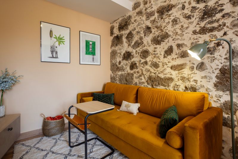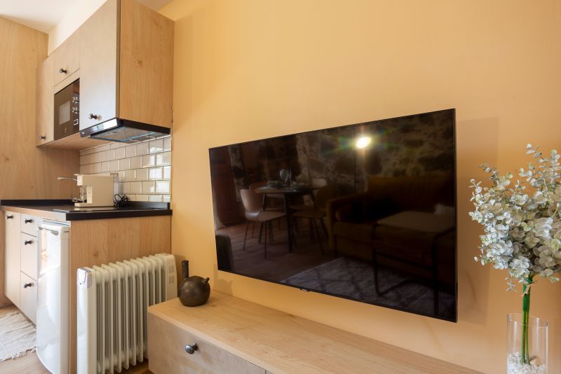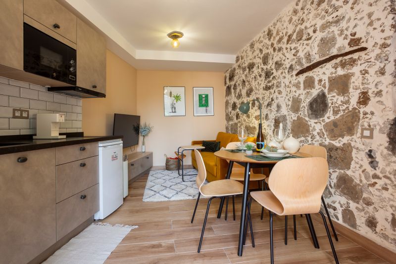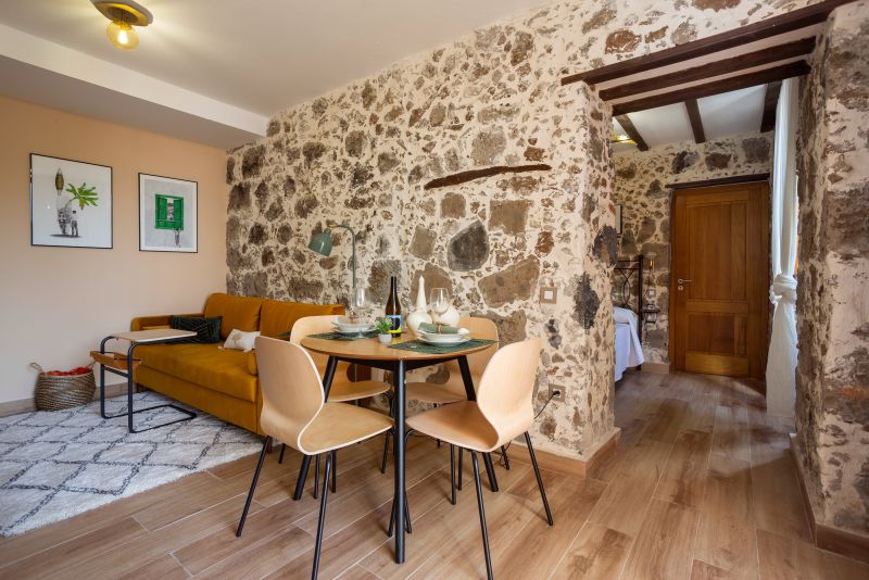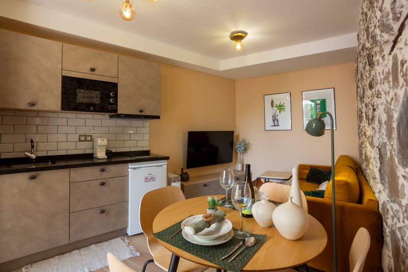 Su acogedor salón - cocina te permitirá pasar una confortable estancia con todos los servicios: Smart TV, wifi, sofá, mesa de comedor, armario, cocina completa con cafetera italiana y de cápsulas y pequeños electrodomésticos.