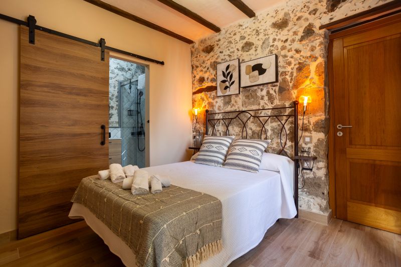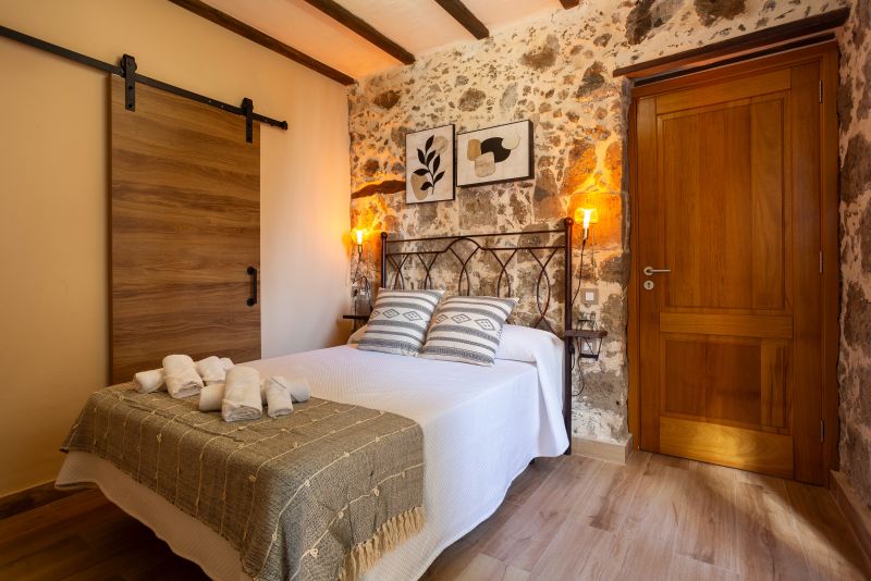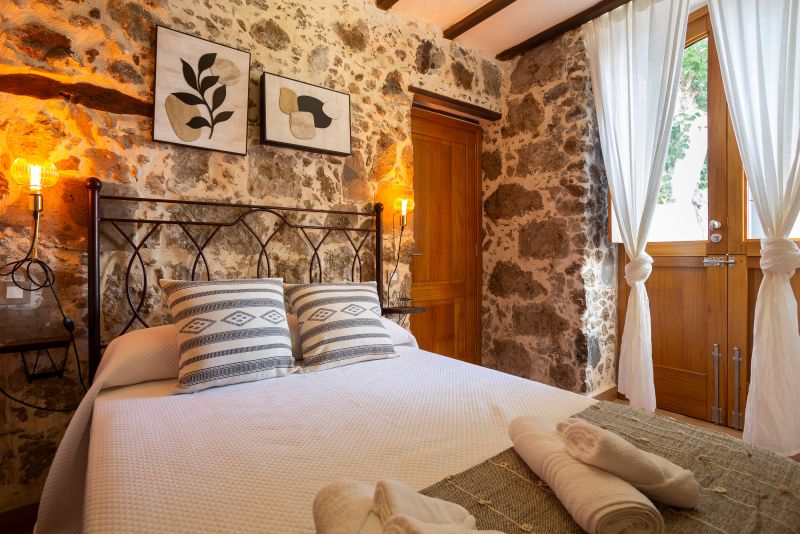 Su dormitorio tiene una cama de 1,35 m y mesitas de noche. Las gruesas paredes de piedra mantienen el fresco en verano y una temperatura estable en invierno, aunque tenemos radiadores de aceite para las noches más frescas.